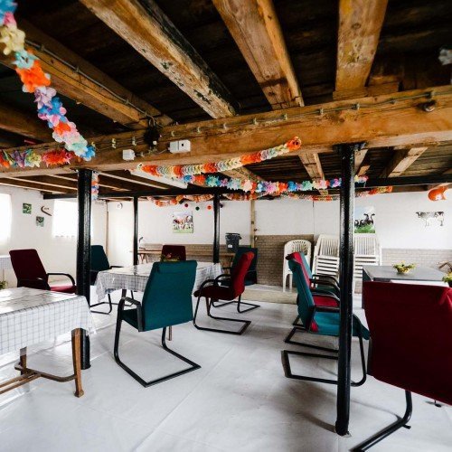 De sfeervolle ruimte kan in een vergaderopstelling ingericht worden, maar ook omgetoverd worden tot feestlocatie. Er is een aanrecht en koelkast aanwezig. Ook heb je de mogelijkheid om de catering zelf te verzorgen, maar het kan ook bij ‘t Koeiestalletje voor je geregeld worden.